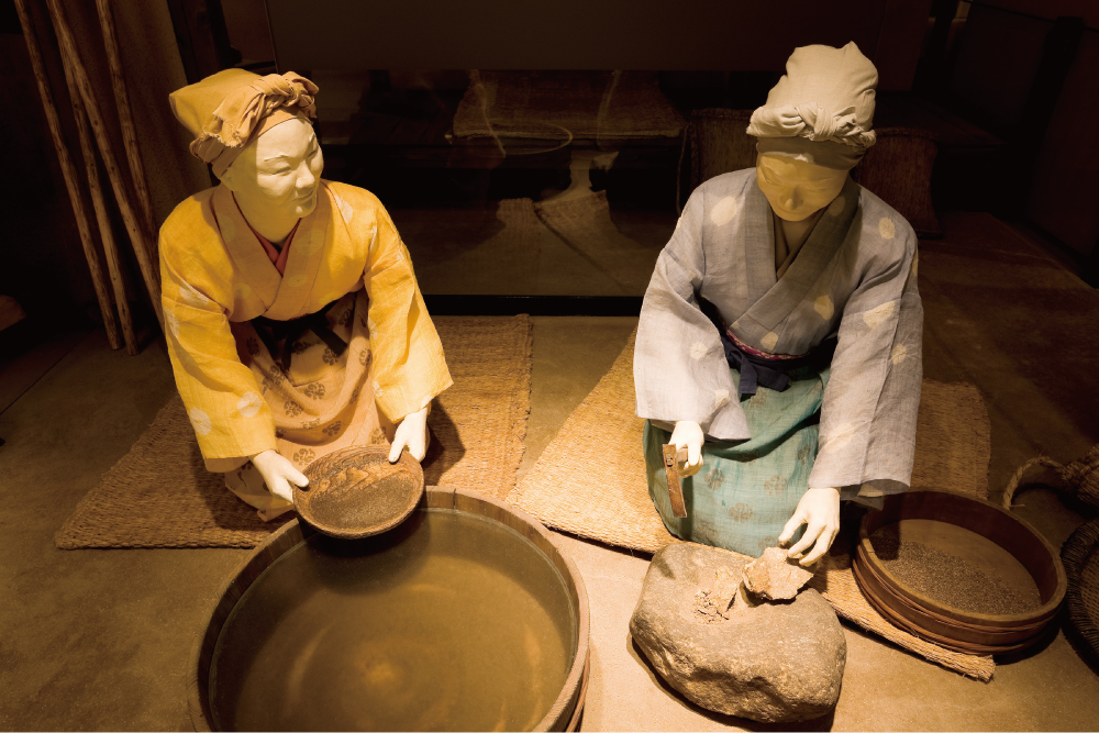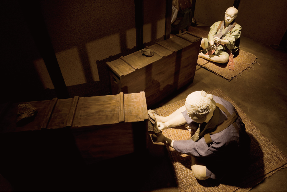 In the Edo period (1603–1867), miners at Iwami Ginzan were easy to distinguish from the general population. Instead of the usual long-sleeved kimono, they dressed in knee-length, sleeveless gray cotton robes tied with rope around the waist. This type of clothing was lightweight and easy to move around in while providing a measure of protection in the cold, dusty mining tunnels.
