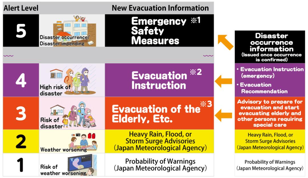 Note 1: Alert Level 5 is rarely issued due to a number of reasons, such as municipal authorities being unable to accurately grasp the severity of a disaster.