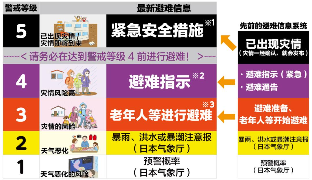 ※3 警戒等级3是指,除老年人之外,其他人也应该开始调整自身行为,做好避难准备,在感觉到有生命危险时主动撤离。