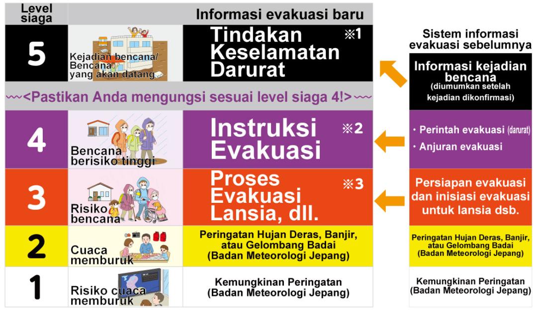 Catatan 3: Level siaga 3 adalah waktu ketika orang-orang selain lansia, dll. juga harus mulai menyesuaikan perilaku mereka atau bersiap untuk evakuasi jika perlu, atau mengungsi atas kemauan sendiri jika merasa dalam bahaya.
