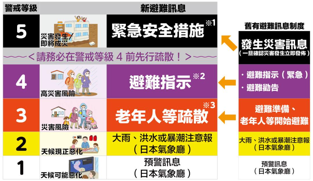 ※1 如遇市町村公所無法準確掌握實際災害狀況等情形,可能無法發佈警戒等級 5 警報,敬請諒察。