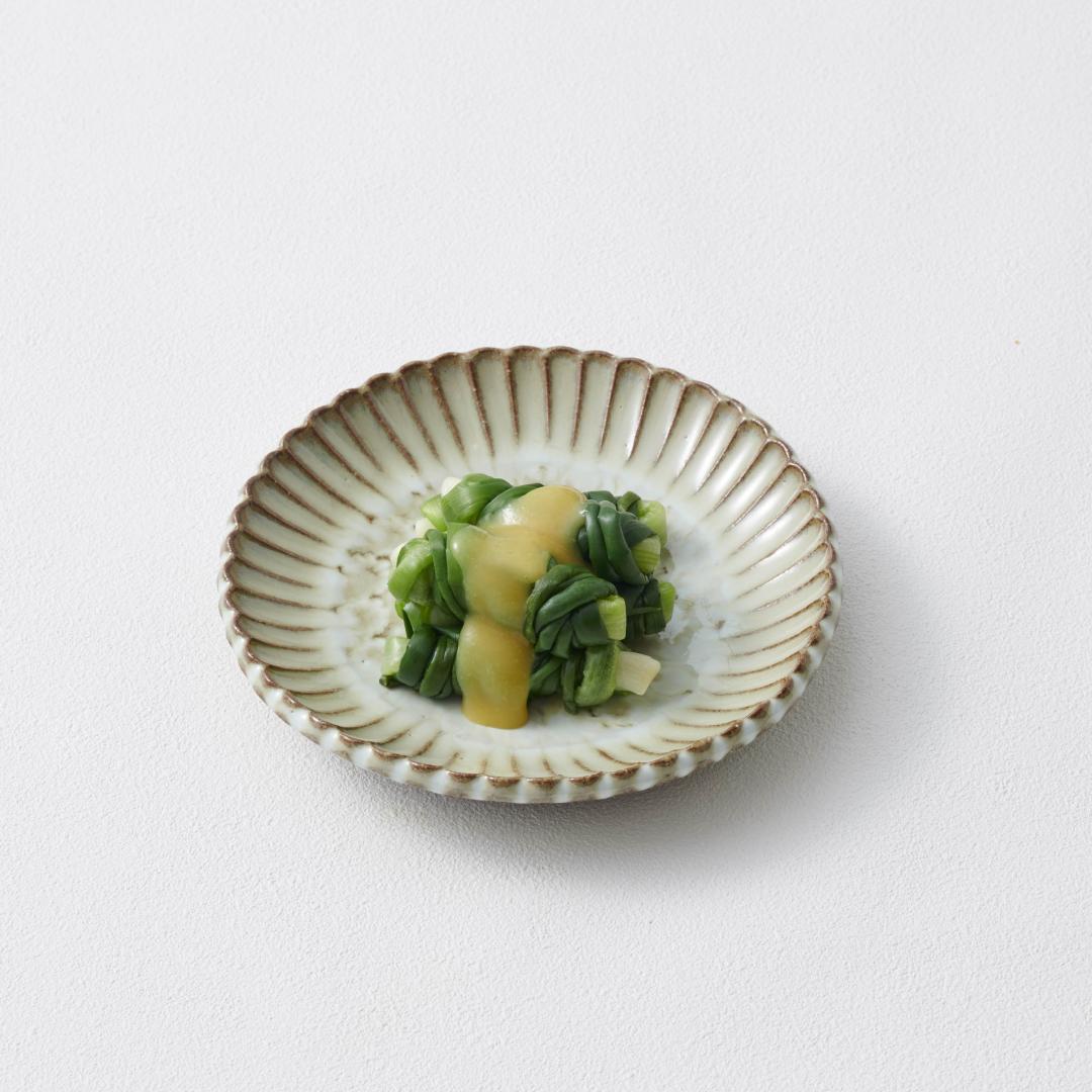 Hitomoji is another name for scallions, which are a specialty of Kumamoto. It is said to have originated as a cheap and delicious snack to go with alcohol, brought about by thrift ordinances issued by the Higo clan in the middle of the Edo period. It got its name from the green leaves that are wrapped (guruguru) around the white roots of the scallions, which are boiled briefly.