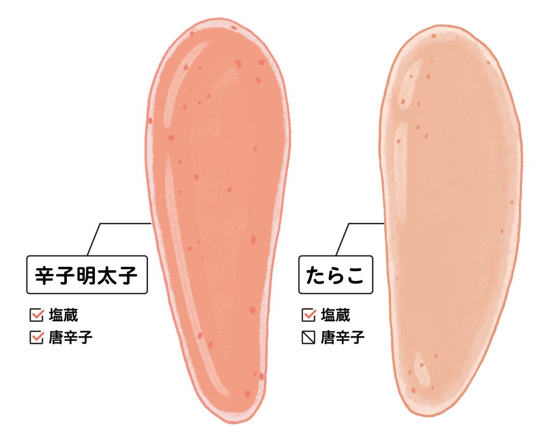 People tend to think that mentaiko and tarako are just different names of the same product, but that's not true. "Tarako" is made by salting pollack roes, and "mentaiko" is made by marinating tarako in a seasoning sauce using chili peppers. In other words, the names are used differently depending on the use of chili peppers.