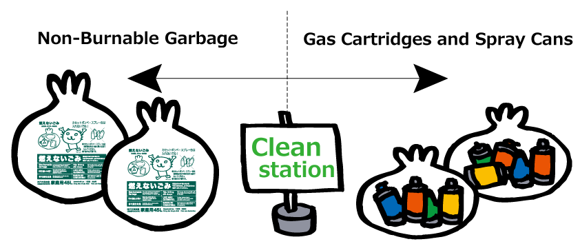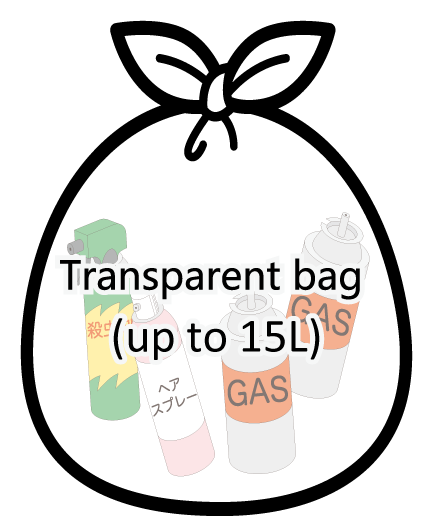 Please ensure all gas cartridges and spray cans are emptied. There is no need to make a hole. Place them in a 15-liter or smaller transparent or semi-transparent bag and put them out at the Clean Station. Please place them separately from non-burnable garbage at the Clean Station.
